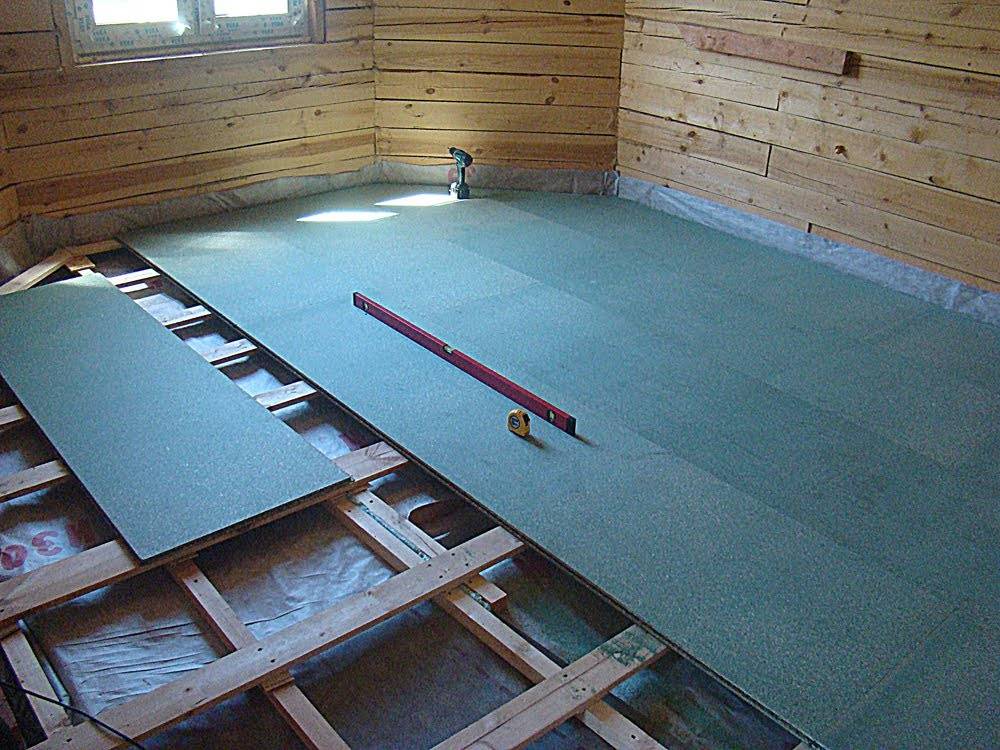 Между материалом и стеной обязательно должен остаться промежуток в 2 см. Пустоту под лагами, образующуюся вследствие неровностей пола, засыпают песком, а промежутки между лагами заполняются утеплительным материалом. При помощи строительного уровня нужно постоянно проверять горизонталь пола. Укладывать листы начинают от дальней стены, расположенной противоположно дверям. Первую плиту крепят на саморезы к лагам. Стоит соблюдать расстоянием между саморезами не более 20 см. Шляпки нужно утопить в плиту на 1-2 мм.