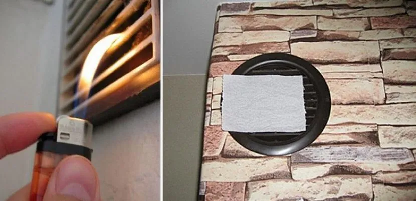- Поднести к решетке вентканала тонкую бумагу (при достаточной тяге лист будет удерживаться на вентрешетке не сдвигаясь и не падая, но если он отклоняется в противоположную сторону, в помещении имеется обратная тяга).