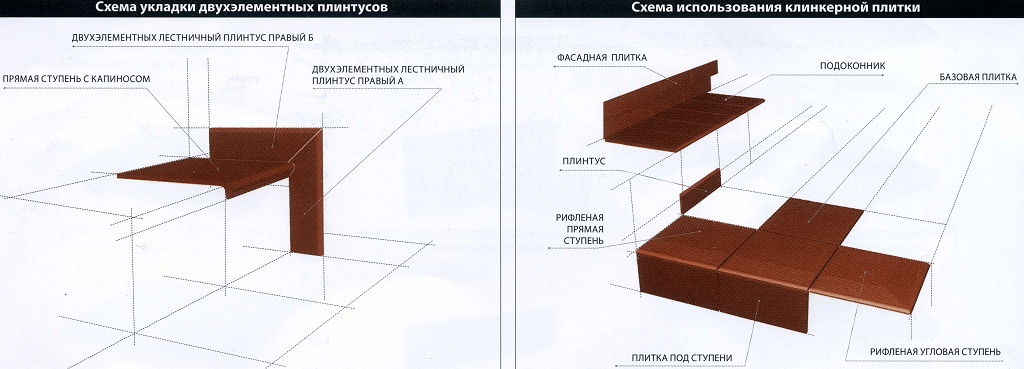 Ступени из клинкера, хотя и не отличаются широким ассортиментом коллекций, выпускают в достаточном количестве форматов. При облицовке можно воспользоваться следующими элементами: ступенями (рядовыми, угловыми, с насечкой, с флорентийским профилем), углами, балконными обкладками, профилированными плитами с углом. плинтусами (рядовым, фигурным, угловым).