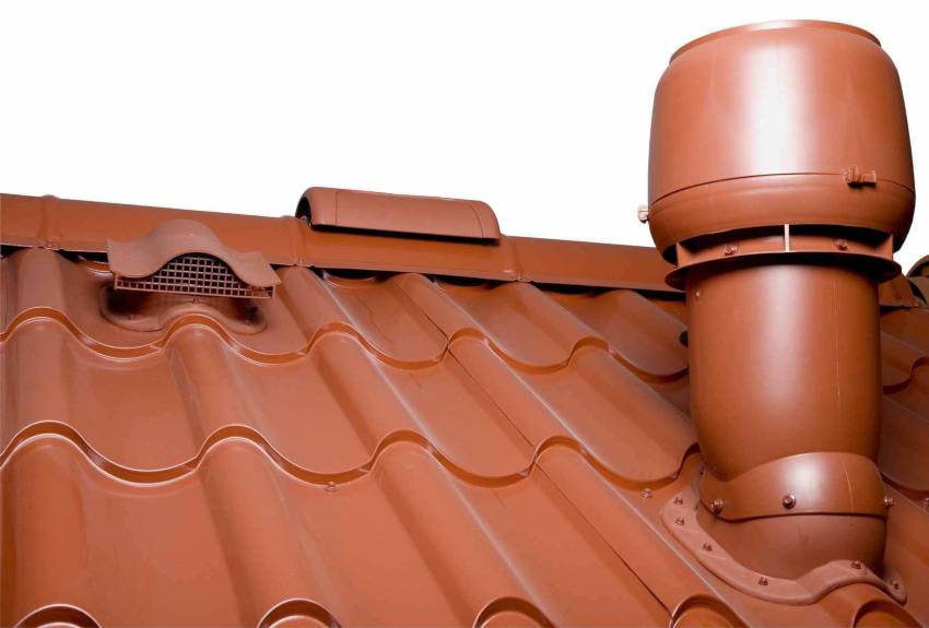 Для хорошего воздухообмена в каждом пролете стропил следует обустроить вентиляционные выходы. Однако, если под крышей располагается неутепленный холодный треугольник, одного элемента будет достаточно на каждые 60 кв. м крыши. В металлочерепице выполняются отверстия, в которые вставляются вентиляционные выходы посредством фиксации их саморезами. Места соединения требуется обработать герметиком.