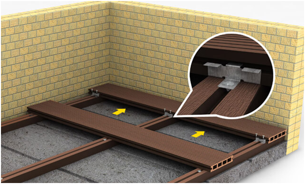 На предварительное подготовленное основание укладывают лаги, высота которых составляет от 20 до 40 мм. Закрепить к основанию их легко, достаточно лишь использовать анкерные болты или пластиковые уголки. При монтаже материала необходимо следовать ряду рекомендаций: