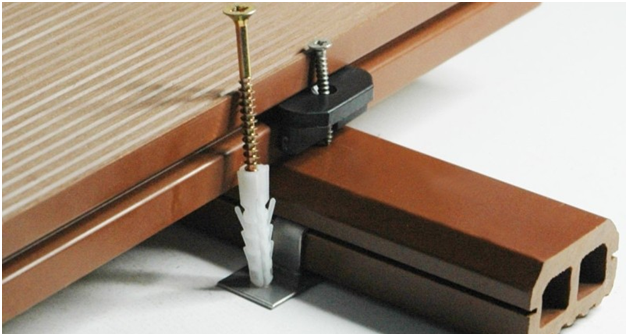 Выполнять работы необходимо теми крепежными элементами, которые рекомендует производитель. Прежде всего, нужно закрепить на лагах начальную клемму или F-профиль, вставить первую доску и зафиксировать ее с другой стороны основными клипсами. Требуется предусмотреть наличие компенсационных зазоров между досок. Их ширина должна составлять не менее 30 мм. Для того чтобы зазоры были максимально ровными и одинаковыми, целесообразно использовать пластиковые ограничители нужного размера.