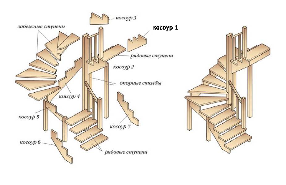- лестницы на косоурах, когда к двум параллельным несущим балкам крепят ступени;