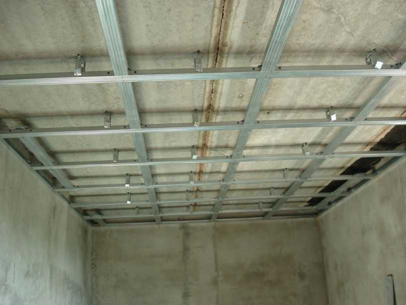 - Прикрепление багетов к основаниям будущего натянутого потолка, монтаж конструкции из металла, укладка звуковой изоляции;