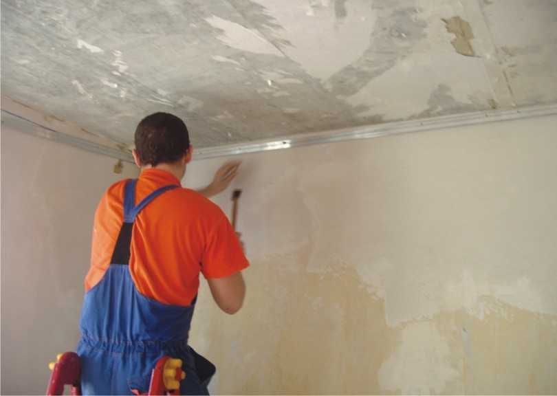 Из помещения необходимо вынести всю мебель и технику, это делается для того, чтобы нам ничего не мешало при работе. После этого нужно удалить старую штукатурку, лучше всего для этого подойдет киянка. Ей следует не сильно бить по штукатурке, после этого ее можно легко убрать руками.