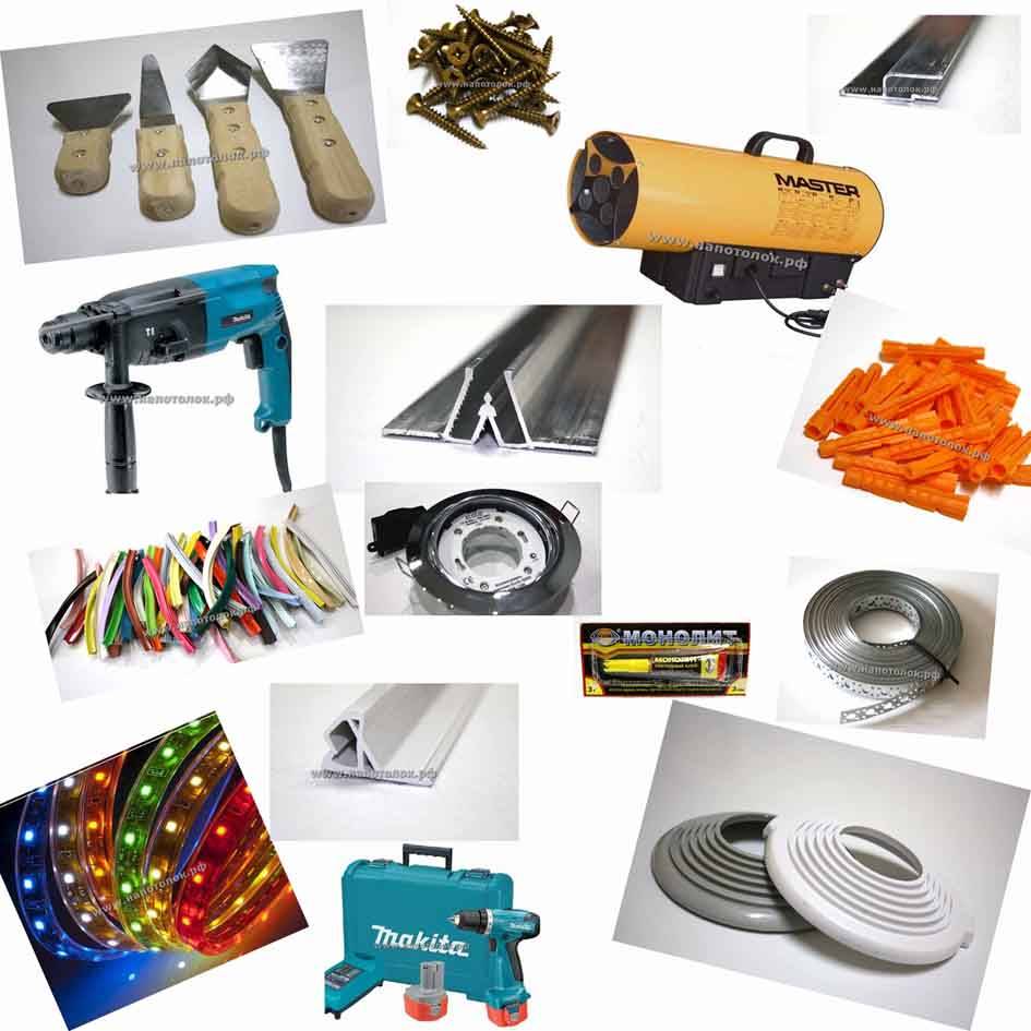 Трудно говорить о точном перечне материалов и инструментов, потому, что различные виды натяжных потолков требуют разного инструмента. Перечислим лишь основные наборы.