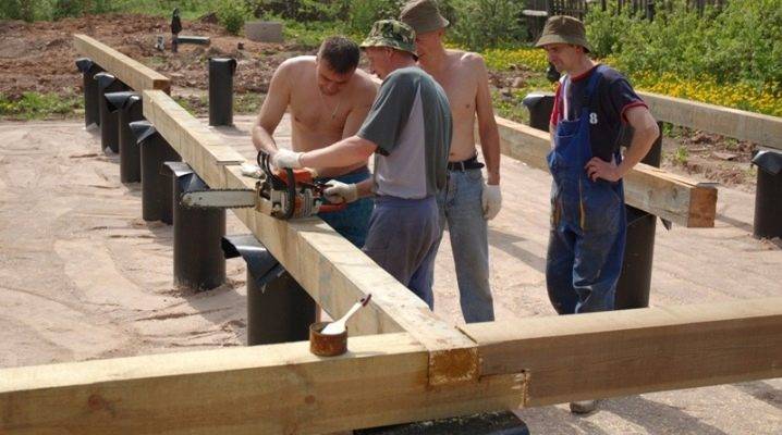 Когда цементно-песчаная смесь окончательно затвердела, на верхних частях свай устанавливаются оголовки. Далее проводится установка обвязки. Для деревянной бани оптимальным выбором будет конструкция из бруса.