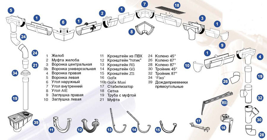 Разнообразные соединительные элементы позволяют придать водостоку необходимую геометрическую форму и организовать направленное отведение воды с крыши. Заглушки устанавливают в торцевых частях желобов, а крепежные элементы – кронштейны и хомуты – позволяют сделать систему устойчивой к нагрузкам.