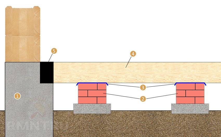 1 — ленточный фундамент; 2 — опорные столбы; 3 — гидроизоляция; 4 — лаги пола; 5 — гидроизоляция лаг
