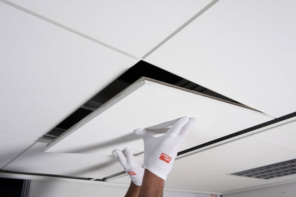 Главная трудность монтажа потолка Армстронг в квартире в том, что плиты в процессе наклоняются под углом 30 градусов, а это, в свою очередь, невозможно, если над каркасом недостаточно пространства