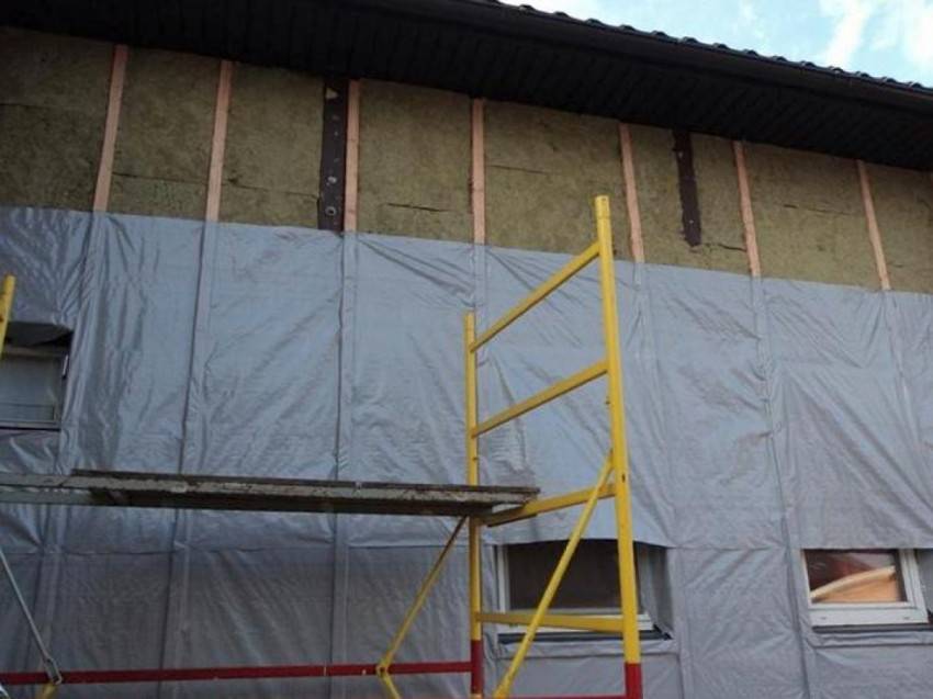 - Когда слой теплоизоляции готов, его покрывают по всей плоскости защитной мембраной, укладывая ее внахлест и закрепляя скобами строительного степлера. Монтаж утепляющего и защитного слоя проводится между планками обрешетки так, чтоб вся свободная поверхность стен была ими укрыта. Стыки и пустоты должны быть загерметизированы монтажной пеной во избежание в будущем мостиков холода.Фасад под сайдинг с утеплением и защитной пленкой