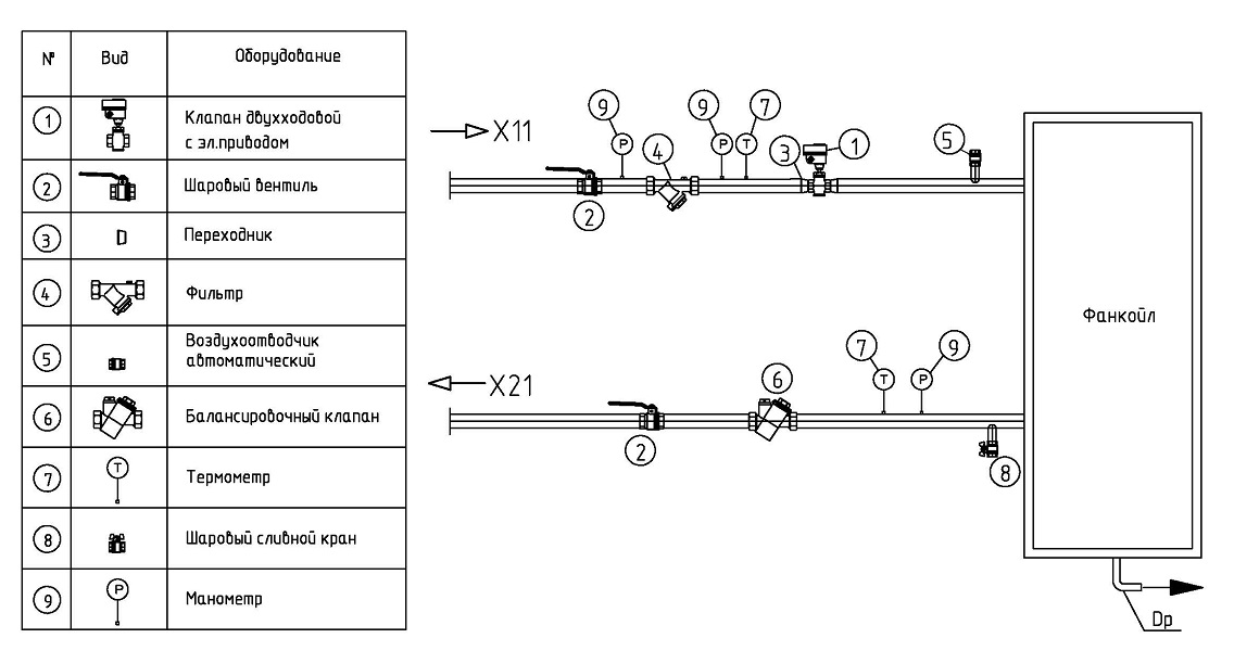Упрощенная схема обвязки 2-х трубного фанкойла (калорифера):