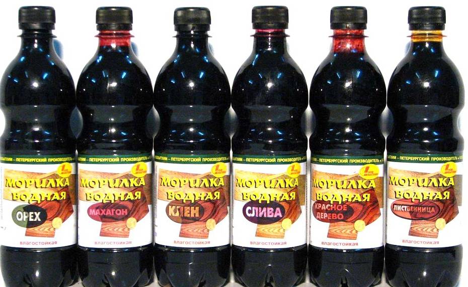 - Морилка для дерева на водной основе. Водорастворимые пигменты окрашивают жидкость и хорошо проникают с водой в структуру древесины;