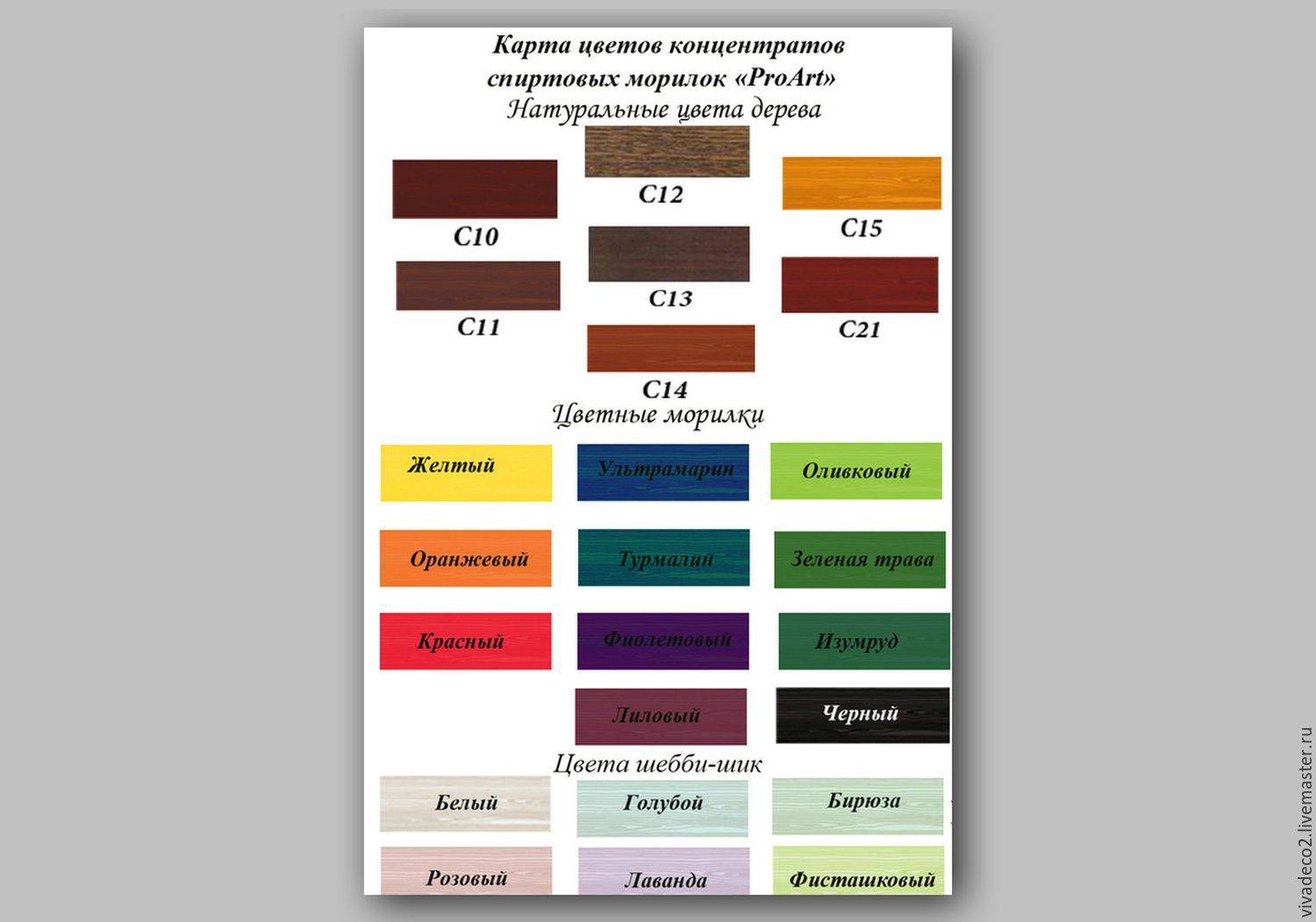 В данной таблице содержится информация о том, каких цветов бывает морилка для дерева.