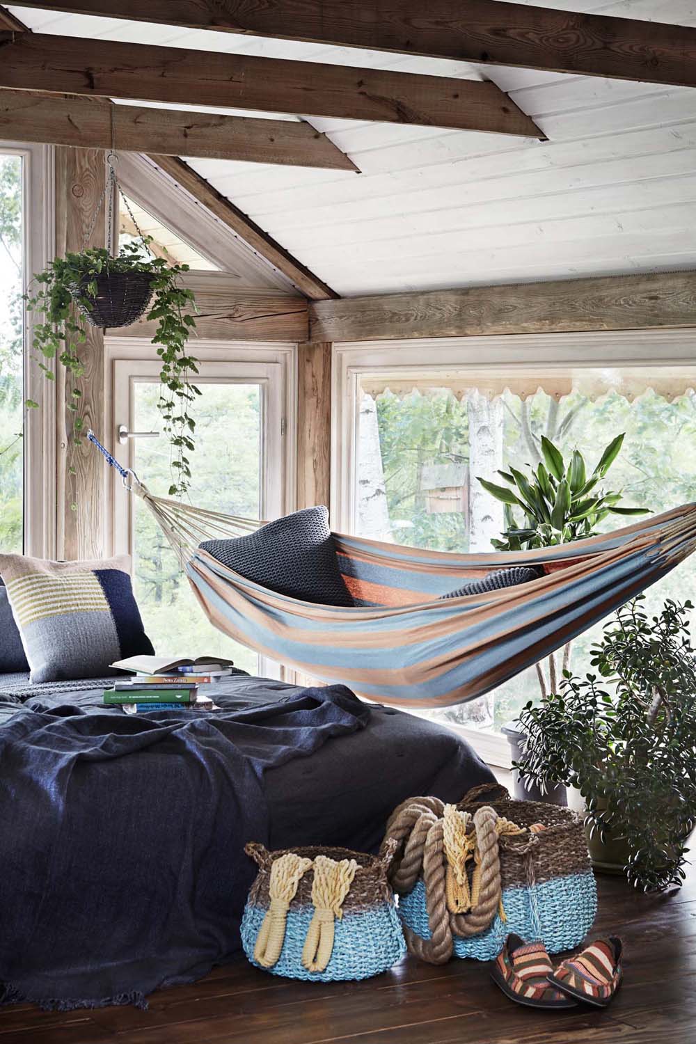 Только представьте, какие в такой спальне будут сниться сны? А экстрималы могут в спальне повесить гамак — если не как спальное место, то в качестве экстравагантного элемента интерьера под потолком.