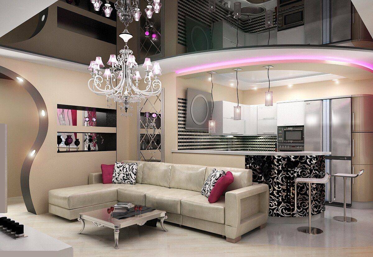 - Нелепо смотрится гостиная, совмещенная с кухней, при этом имеющая искусственную изогнутую перегородку из натуральной древесины. Такая комната часто обставлена мягкими диванами.