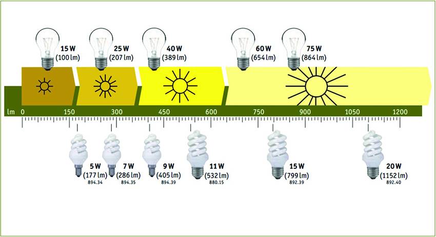 Нижеприведенная таблица показывает соотношения энергосберегающей лампы и лампы накаливания: цифры – средний показатель указывает на то, что одинаковый свет подают лампы, с разной мощностью (разница приблизительно в 5 раз). Так, например лампочка накаливания в 100 Ватт работает так же как энергосберегающая в 20 Ватт