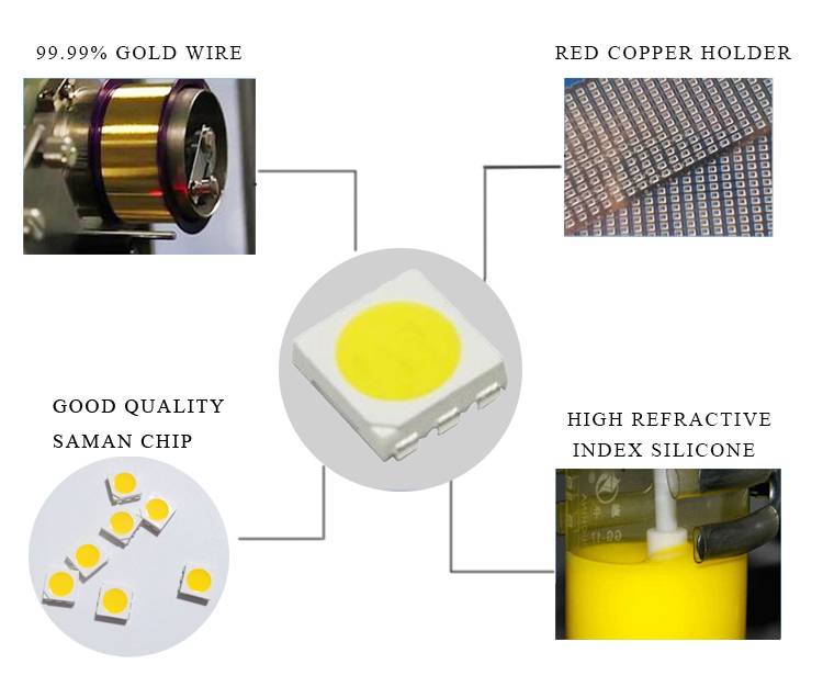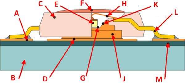 Конструктивно осветительные SMD представляют собой покрытый люминофором излучающий кристалл на теплоотводящей подложке, обычно медной или алюминиевой. Встречаются как разновидности с линзой, так и без нее.