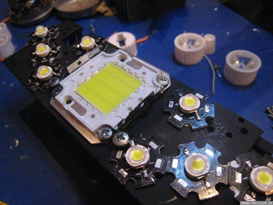 На картинке вверху показаны для сравнения Cree SMD 5050 (слева) и COB – матрица из 36 чипов (справа).