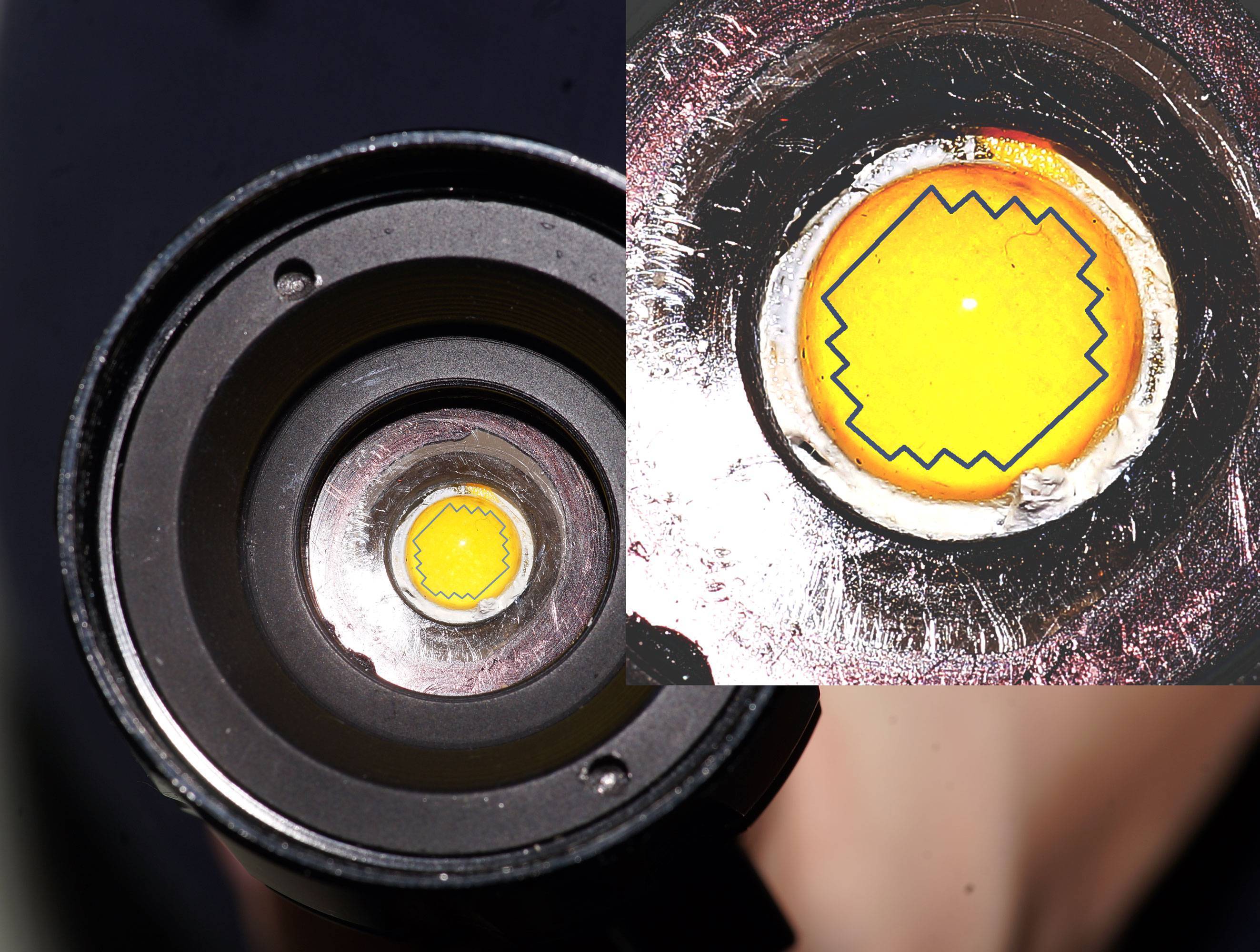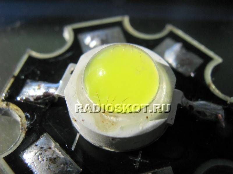 Для улучшения спектральных характеристик и некоторого изменения цветовой температуры в компаунд добавляется специальный люминофор. Если хорошо присмотреться, то сквозь защитное покрытие можно разглядеть кристалл с токоподводящими проводками.