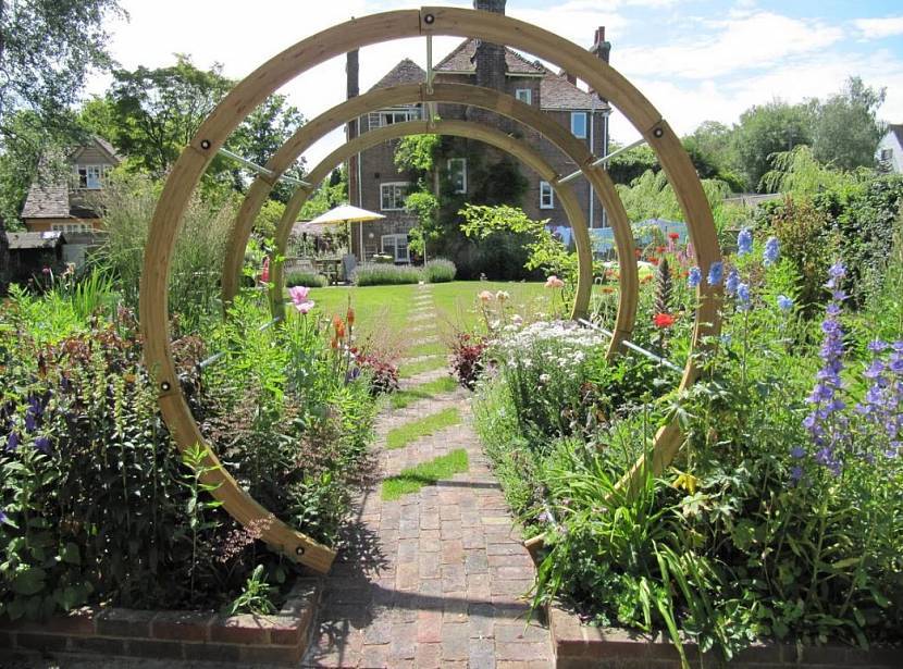 Трельяж или двухсекционная арка, установленная в месте главного входа в сад, выгодно подчеркнёт стиль владельцев. Особенно ярко это будет прослеживаться после того, как её ячейки заполнятся вьющимися растениями.