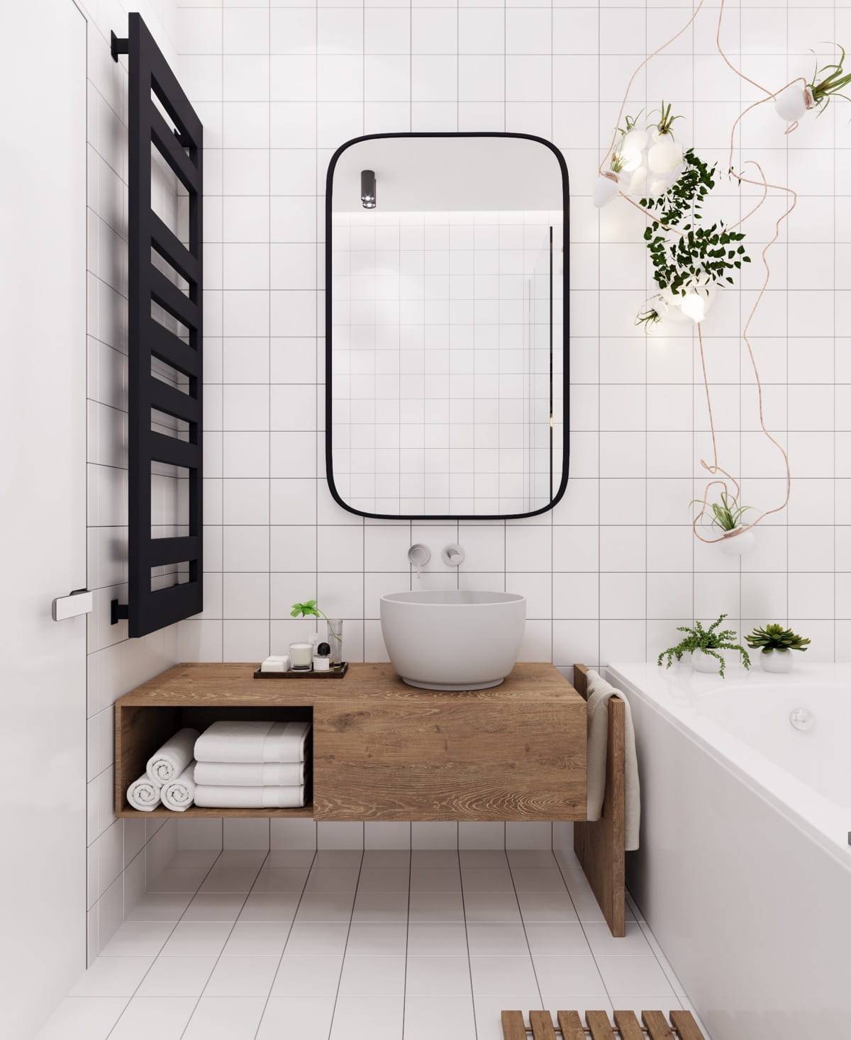 - Сегодня можно использовать аксессуары «под дерево» или под натуральный камень. Стоить заметить, что белая плитка в ванной комнате может помочь вам визуально расширить или, наоборот, сузить пространство. Для этого две стены нужно сделать светлыми, а две – тёмными. Таким образом, узкая ванная комната будет казаться немного шире.