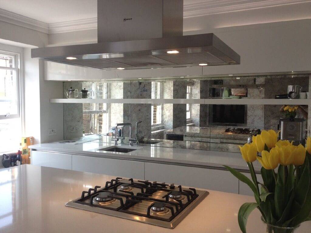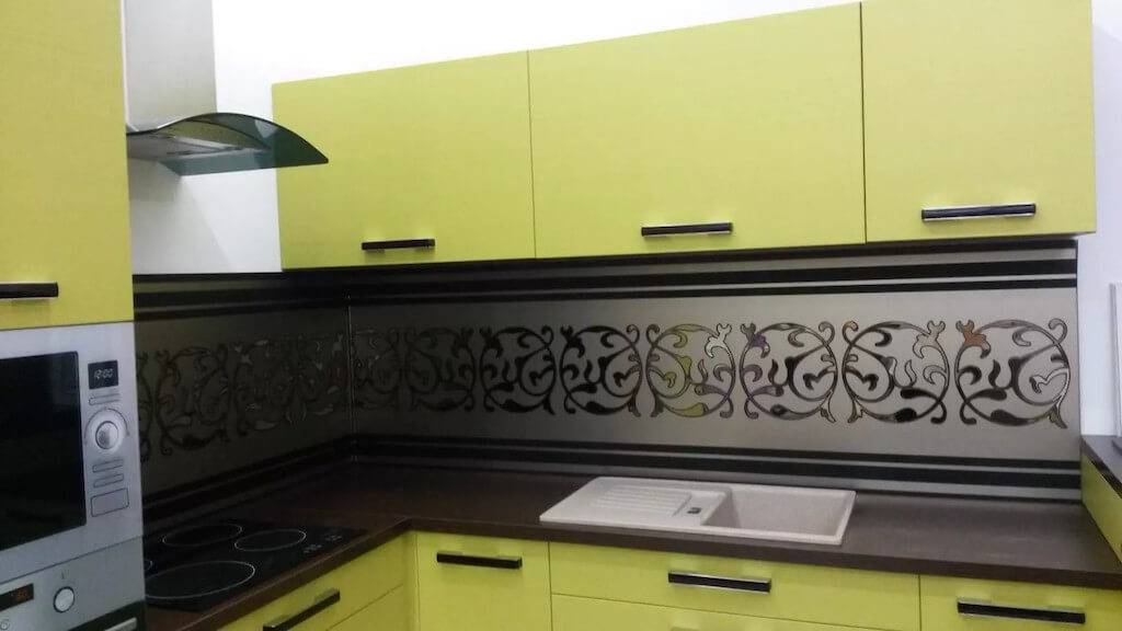 - Зеркальный фартук – стильное решение, увеличивающее зрительно пространство.