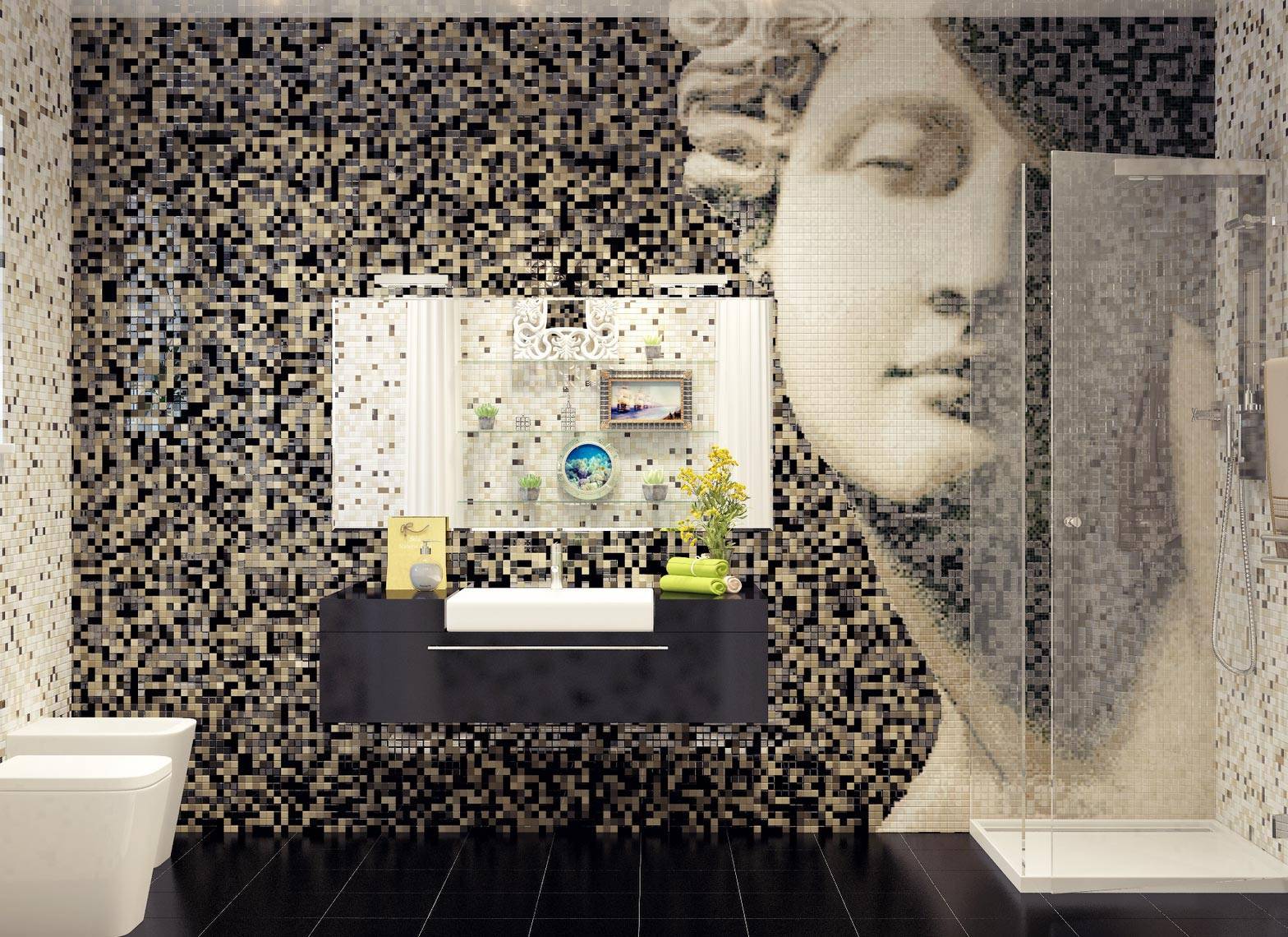 Мозаика – идеальный вариант для помещений со сложной геометрией. Во время оформления стен не придётся отрезать лишние куски плитки, перерасход плитки будет минимальным.