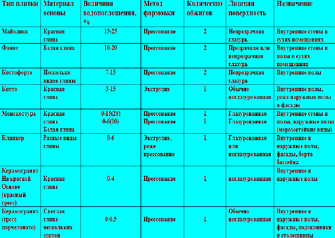Таблица применения керамической плитки в зависимости от способа изготовления.