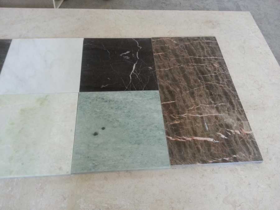 Песчаник бывает разным – красным, бежевым, розовым, зеленым, синим, голубым, серым, коричневым, черным. Его шлифуют, добиваясь гладкости поверхности. Затем на нее наносят полимерный клей и покрывают основой, оставляя сушиться. После полимеризации связующего состава основу снимают вместе со слоем мраморного рисунка. Заготовку оставляют на солнце для окончательной сушки. В итоге получается эластичный материал с дорогим внешним видом и уникальным рисунком.