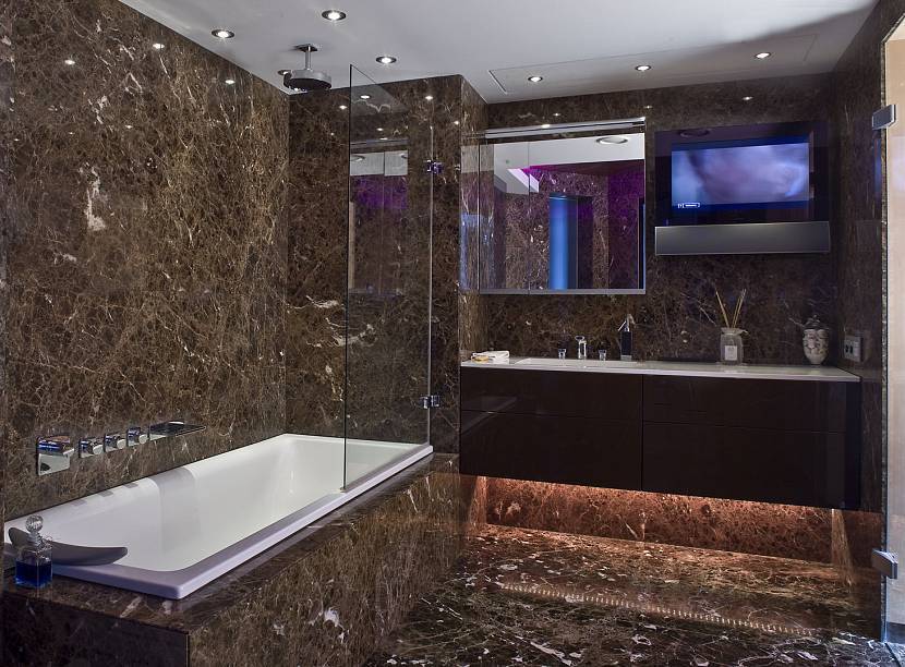 Очень изысканно смотрится комната, отделанная белым и серым камнем, все детали должны быть продуманы до мелочей, так как светлые тона не терпят фальши. Синий и черный мрамор не такой маркий, им чаще отделывают пол либо также стены в общественных помещениях.