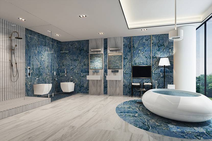 За счет удивительной расцветки синий мрамор в интерьере используется как доминирующий или с его помощью создаются акцентные цветовые пятна, подчеркивающие уникальную необычность композиции.