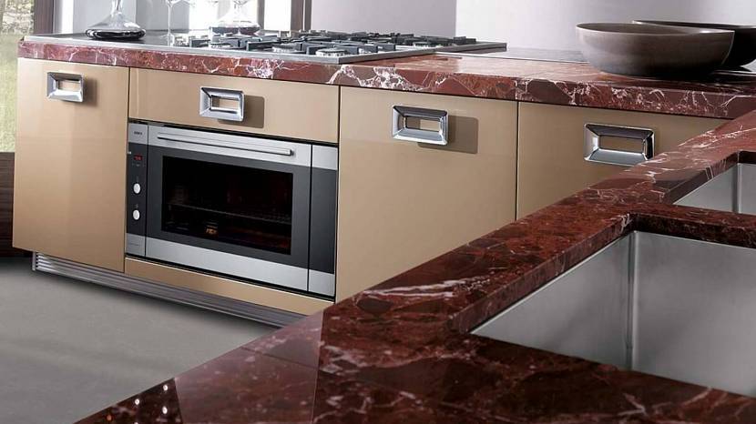 Кантри. В этом стиле много натуральных материалов и оттенков, преимущественно светлых. Деревянная или плетеная мебель прекрасно дополнится рабочей столешницей, выполненной из бежевого или зеленого мрамора.