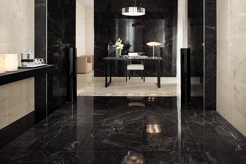 Полы являются именно тем местом, где можно хорошо показать всю красоту мрамора. При правильном освещении мрамор будет просто удивительно выглядеть и радовать своим неотразимым видом. Проявите весь креатив и творчество при выборе оттенка мрамора и узора. Вы точно сможете найти мраморные плитки, которые будут сочетаться со стилем . Только по такому полу нельзя ходить на каблуках, разливать напитки, иначе появятся пятна и царапины. При использовании темного мрамора, как на этом фото, стоит помнить, что помещение в таком случае должно быть хорошо освещено, иначе создастся впечатление узкого и маленького пространства. Необходимы источники и естественного, и искусственного света.