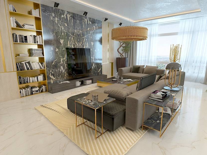 Полированный мрамор с богатой цветовой палитрой в серых тонах и различными вкраплениями среди дизайнеров является самым излюбленным видом отделочного материала.
