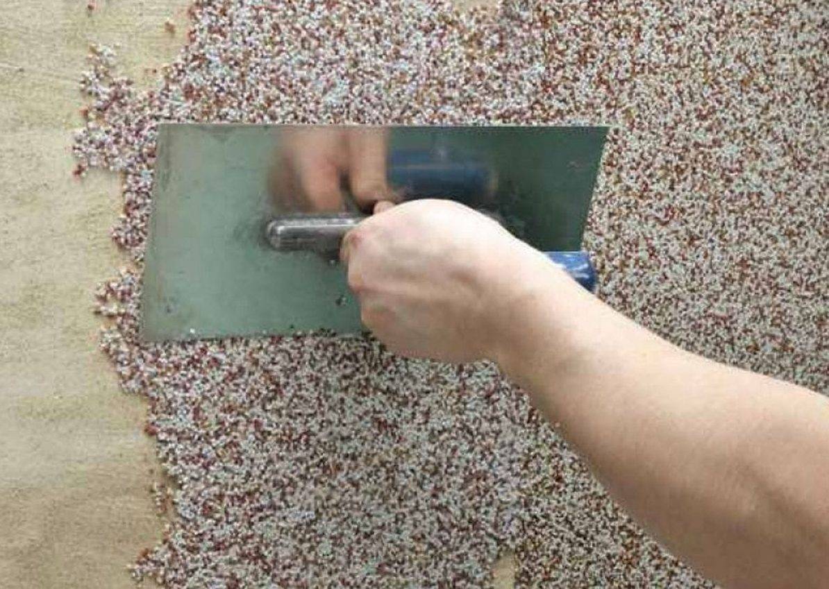 Немного смеси захватывают из емкости маленьким шпателем, затем равномерно распределяют по заостренной части широкого и растирающими движениями с минимальным усилием накладывают на поверхность. Оптимальная толщина слоя – полтора диаметра крупнофракционной крошки в составе материала.