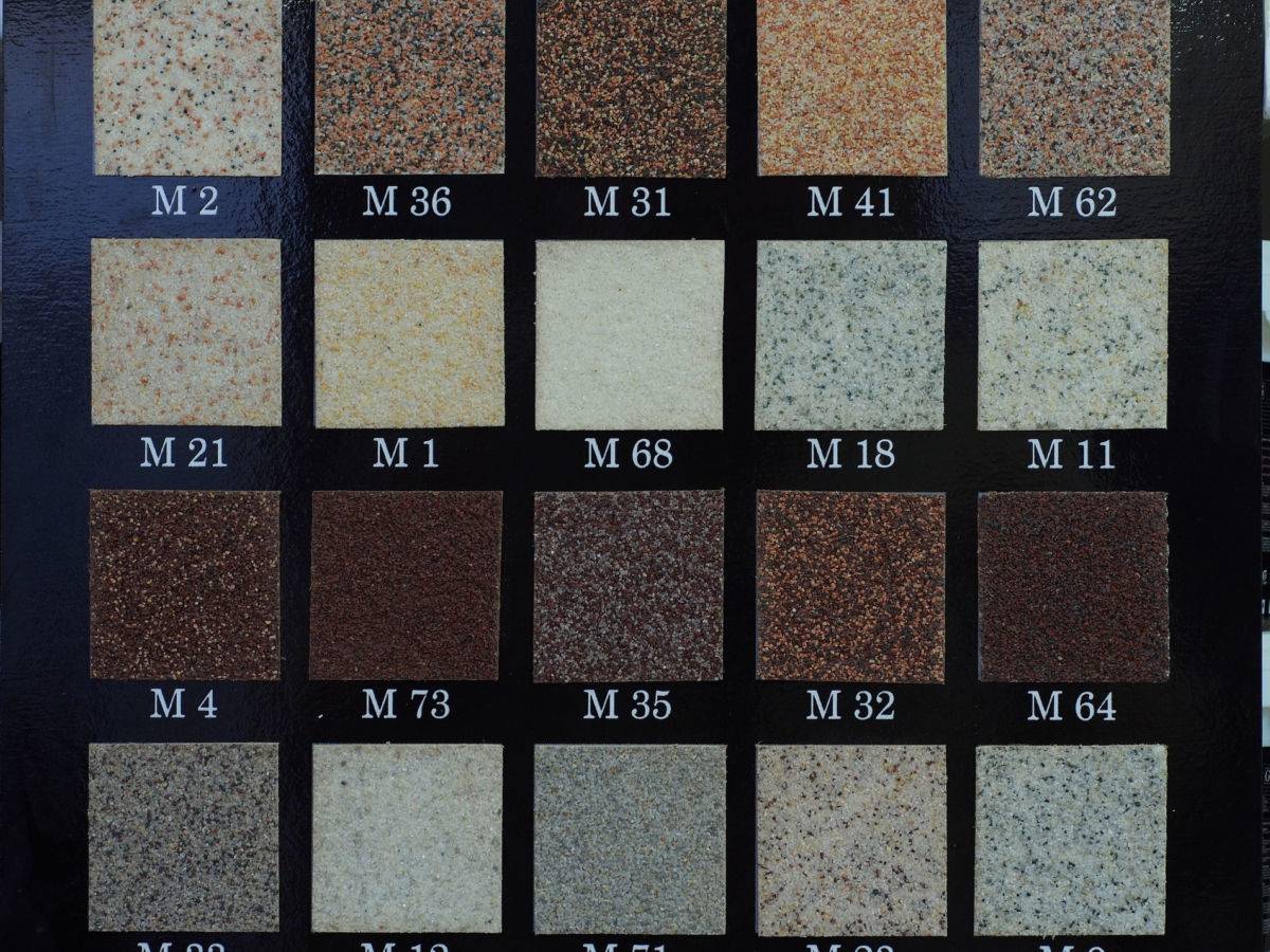 Основным компонентом штукатурки является наполнитель – молотый мрамор или гранит различной зернистости. Гранулы наполнителя имеют богатую палитру природных оттенков, но для повышения декоративности покрытия очень часто их подкрашивают по специальной технологии. В качестве связующего большинство производителей используют акриловые смолы, хотя есть мраморные штукатурки и на минеральной основе. Различить их несложно: акриловые составы прозрачные и полупрозрачные, минеральные – белые и цветные.