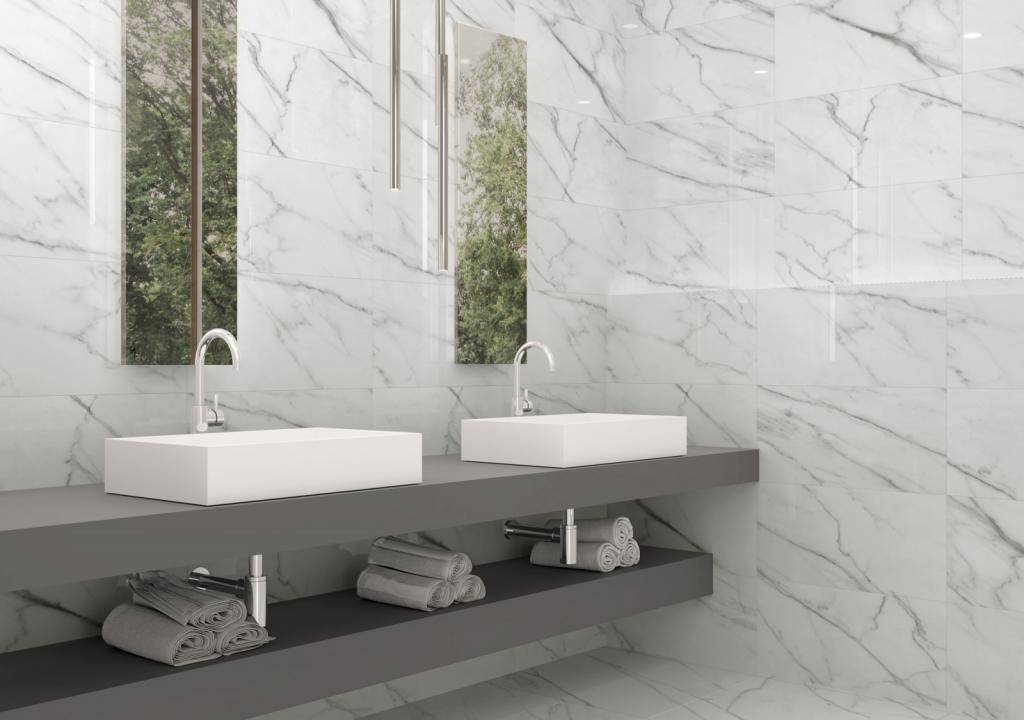 Когда ванную комнату планируется полностью отделывать плиткой, рекомендуют использовать разные виды на стенах и полах. Это делается для того, чтобы поверхности гармонично сочетались между собой, а их границы не были размытыми.