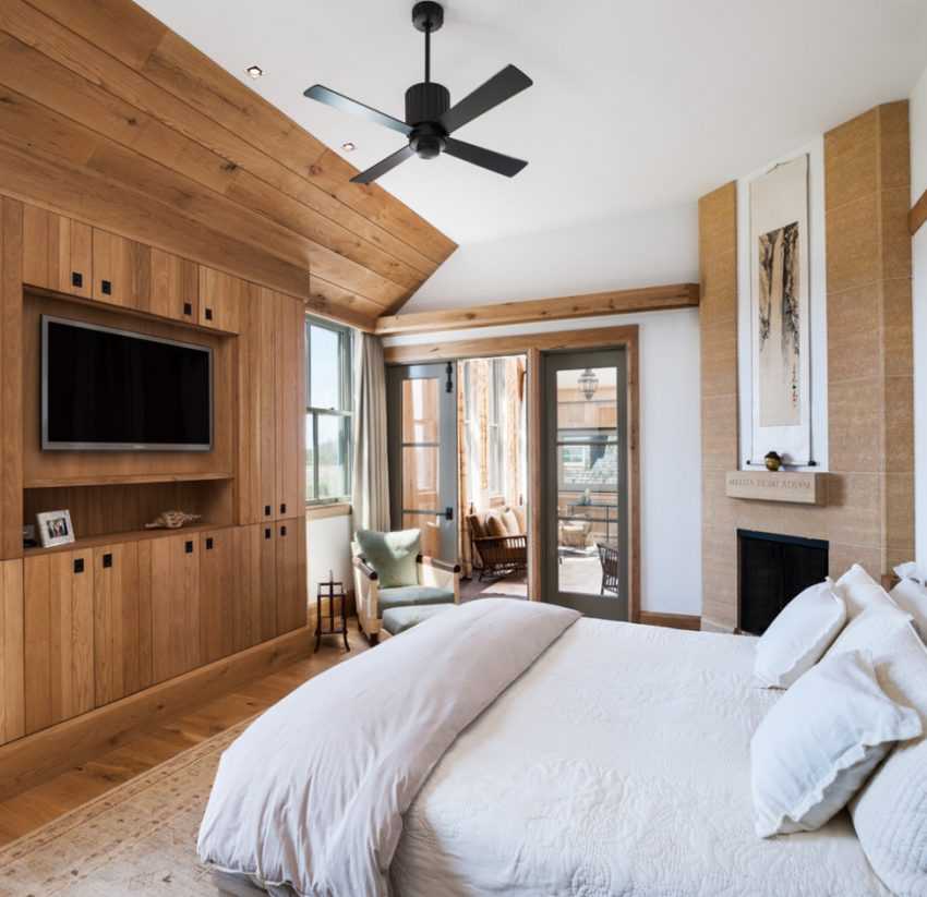 Это создаёт поле для манёвра, помогает сделать интерьер удобнее, а процесс просмотра телевизора лёжа в кровати станет ещё приятнее. Можно подстраивать угол экрана под каждого из «жителей» спальни, который лежит слева или справа на кровати.