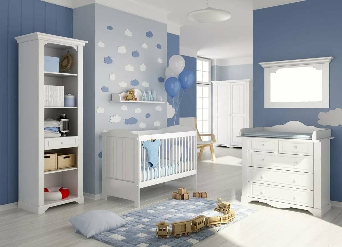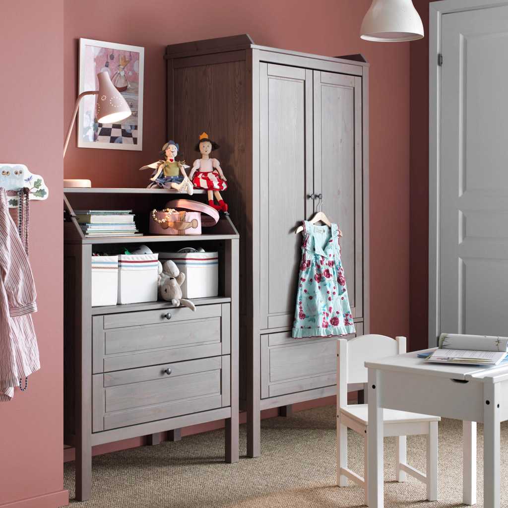 Не стоит приобретать изделия на вырост. Для меблировки интерьера комнаты младшего члена семьи достаточно установить небольшой шкаф для хранения одежды, кровать, письменный стол по возрасту, стул или кресло, прикроватную тумбу и стеллаж. Детям школьного возраста, если позволяет площадь помещения можно приобрести парту и книжный шкаф.