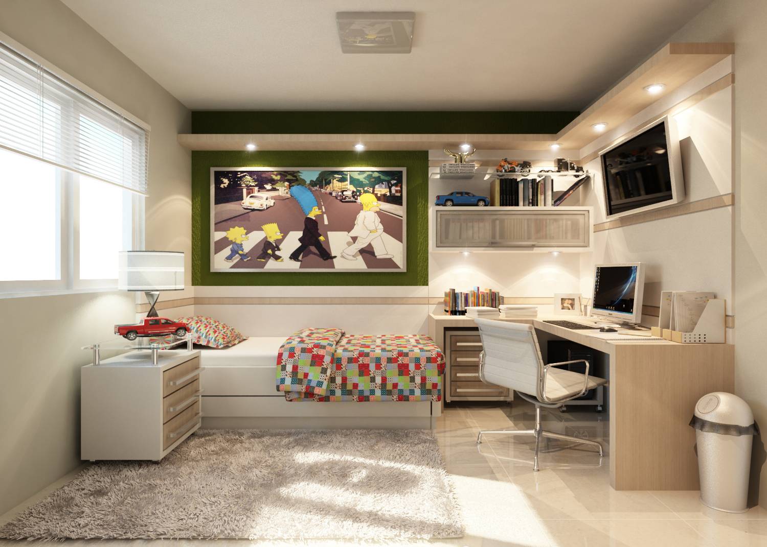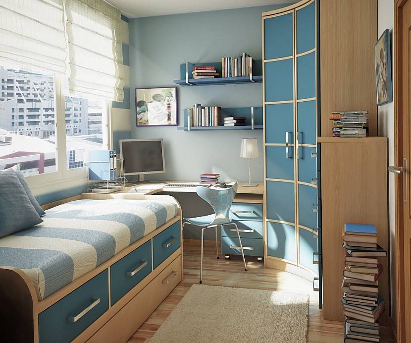 Зона отдыха. Для нее лучше выделить место подальше от окна. Если комната предназначена для одного ребенка, практичным решением будет приобрести раскладную или диван-кровать с удобной нишей для постельного белья. Если комнату делят двое подросших деток, выгодным будет приобретение двухъярусной кровати. Освободить пространство помогут выдвижные, складные и откидные конструкции.