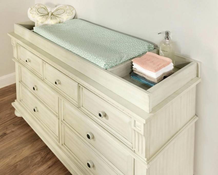Для большего удобства лучше выбирать плоскость с просторным и глубоким пеленальным местом. Сами ящики могут быть не очень глубокими, при этом откидная крышка детского комода-столика выступает вперед, создавая дополнительное пространство, а в сложенном виде образует еще одну полку.