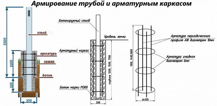 В центр ямы забивается стальная труба или пучок арматурных прутьев (3 — 4 прутка с сечением от 10 мм). Высота арматурного каркаса будет зависеть от высоты столба и забора.