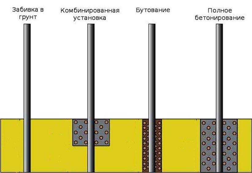 Столбы устанавливаются на расстоянии равному длине секции будущего забора, желательно не большим, чем 2,5 м. Для них пробуриваются ямы, глубина которых должна быть не меньше глубины промерзания почвы. На дно каждой ямы засыпается песчаная подушка толщиной до 20 см. Сверху подушка засыпается щебенкой такой же толщины. Все тщательно утрамбовывается и заливается водой.