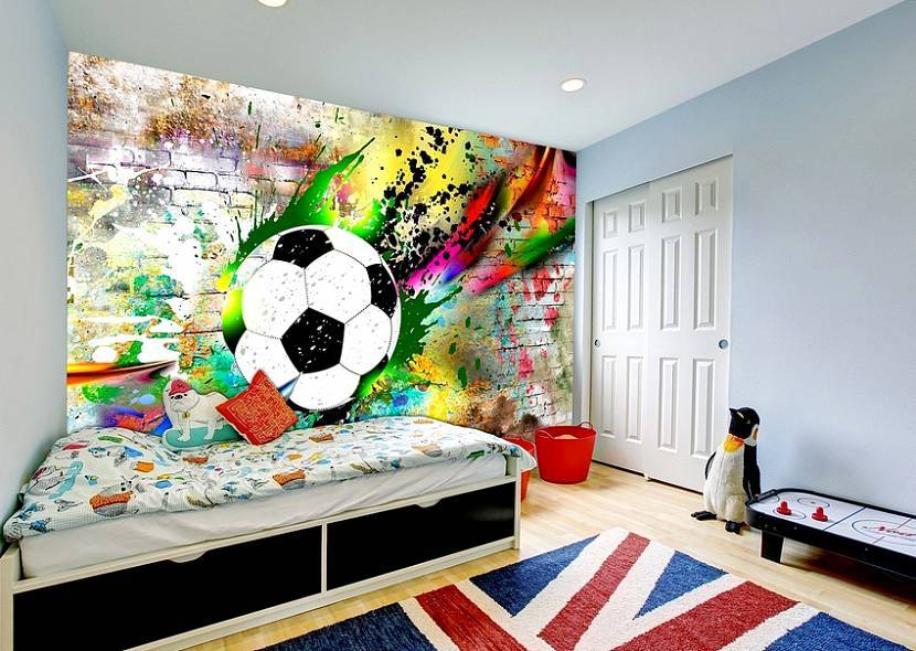 Комната для мальчика-футболиста может быть оформлена в светлых тонах, а стену возле кровати украшает граффити, в центре которого нарисован большой футбольный мяч. Для декорирования помещения этого достаточно.