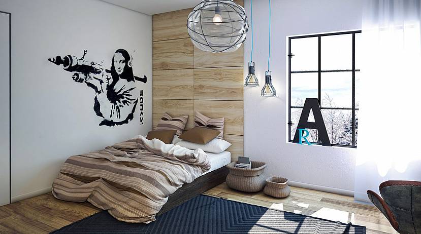 В интерьере спальной комнаты, оформленной в нейтральной цветовой гамме, небольшое граффити и рисунок на всю стену станет ярким цветовым акцентом, наполняющим помещение динамикой и свободой.