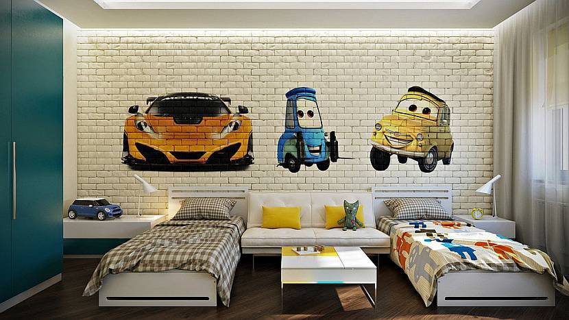 Для создания лаконичного дизайна в комнате для двоих детей, рисунок может быть нанесен на стену, расположенную возле спальных или рабочих мест. Для визуального разделения функциональных зон можно использовать разные рисунки.