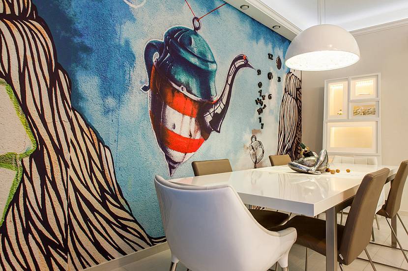 Ни одной декоративное покрытие не сравнится с граффити на стене. Универсальность и практичность необычного рисунка позволяет объединить в одном помещении смелую фантазию и реальность.