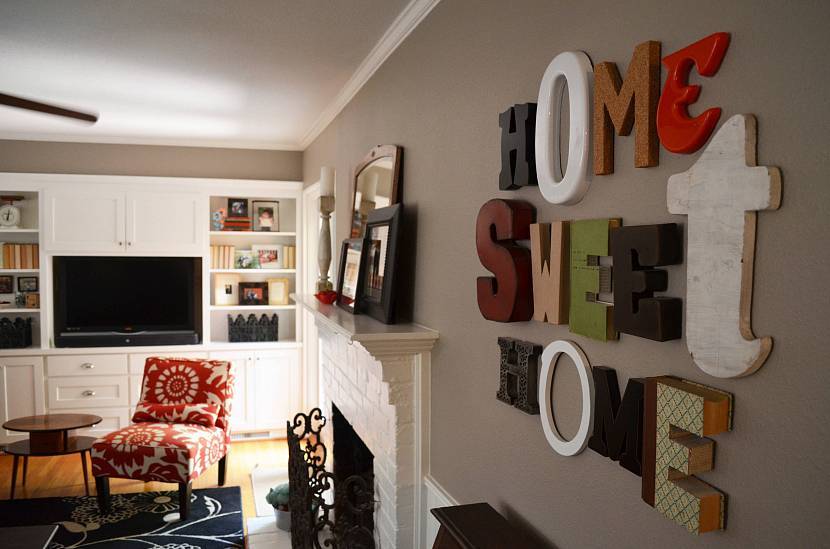 Для гостиной характерны теплые надписи из серии «Милый дом», «Семья», а также цитаты и афоризмы на позитивные темы. Надписи на стене можно комбинировать с фотографиями; результат поднимет настроение и хозяевам, и их гостям. Буквенный декор служит старым способом украшения пространства над камином к Новому году и Рождеству.