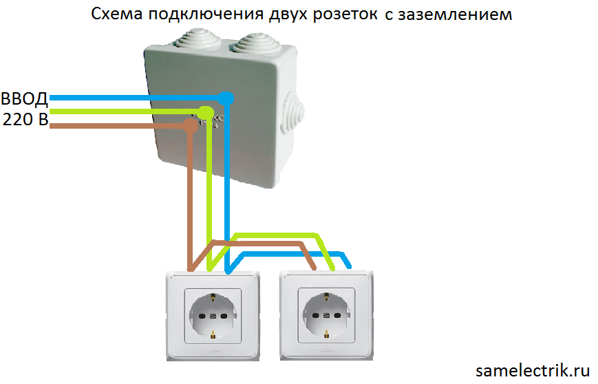 В данном случае будет происходить подключение двух розеток к одной линии проводки, поэтому для первой розетки понадобится 6 проводов, а для второй прокладывается шлейф из 3-х основных проводов.